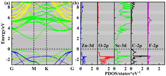 (a) The projected band structure and (b) PDOS of the SC-Ⅰ ZnO/Sc2CF2 heterostructure.
