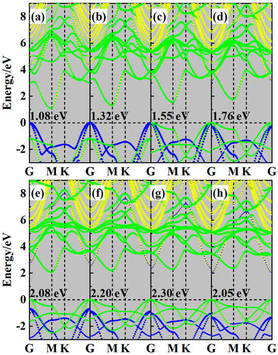 The projected band structures of (a) −8%, (b) −6%, (c) −4%, (d) −2%, (e) 2%, (f) 4%, (g) 6%, and (h) 8% strained ZnO/Sc2CF2 heterostructures. The insert values represent the corresponding Eg for strained heterostructures.