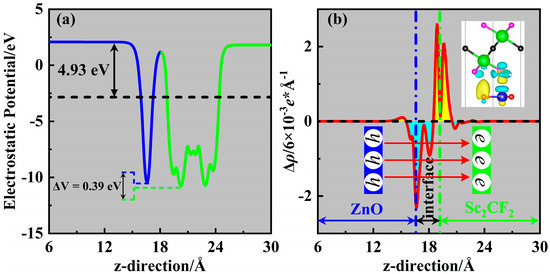 (a) The electrostatic potential of the ZnO/Sc2CF2 heterostructure. (b) The planar-averaged charge density difference Δρ for the ZnO/Sc2CF2 heterostructure; the insert is the side view of the charge density difference with its isosurface value of 3 × 10−4 e*Å−3.