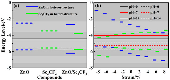 (a) The band edge positions of the ZnO/Sc2CF2 heterostructure, as well as those of pristine monolayers. (b) The band alignments of strained ZnO/Sc2CF2 heterostructures. The solid and dashed lines are the oxidation and reduction potentials, respectively.