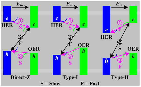 The photocatalytic mechanisms of the ZnO/Sc2CF2 heterostructures are illustrated in Figure 7. As previously mentioned, when the two monolayers come into contact, charge transfer occurs in the interface, leading to the ZnO layer becoming positively charged and the Sc₂CF₂ layer being negatively charged. The charge transfer results in the energy bands in the ZnO layer bending upward whereas those in the Sc₂CF₂ layer bend downward, as displayed in Figure 7. The band bending of the two layers generates extra potential barriers. When the ZnO/Sc2CF2 heterostructure is illuminated, electrons are excited to the CBM of ZnO and Sc2CF2, leaving holes in the VBM. Then, the carrier transfer, occurring in the ZnO/Sc2CF2 heterostructures between the ZnO and Sc2CF2 layers, follows three main pathways [28]: ① electrons transfer between the CBM of ZnO and CBM of Sc2CF2; ② the recombination of the electron-hole between the VBM of ZnO and the CBM of Sc2CF2 (the CBM of ZnO and the VBM of Sc2CF2 in a type-Ⅱ alignment); ③ holes flow from the VBM of Sc2CF2 to the VBM of ZnO (the VBM of ZnO to the VBM of Sc2CF2 in a type-Ⅱ alignment). The diffusion (① and ③) and the recombination (②) are competing paths for photo-generated carriers.