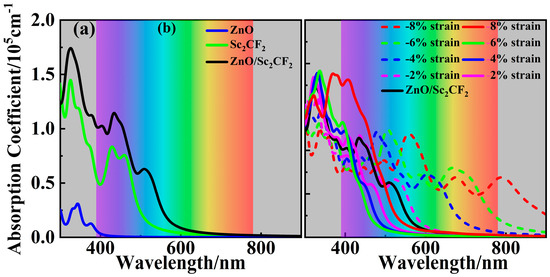 (a) The absorption coefficients of the ZnO/Sc2CF2 heterostructure and two freestranding components. (b) The absorption coefficients of strained ZnO/Sc2CF2 heterostructures.