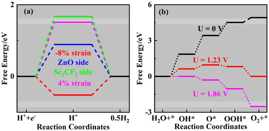 Gibbs free energies for the (a) HER and (b) OER occurred in ZnO/Sc2CF2 heterostructures.