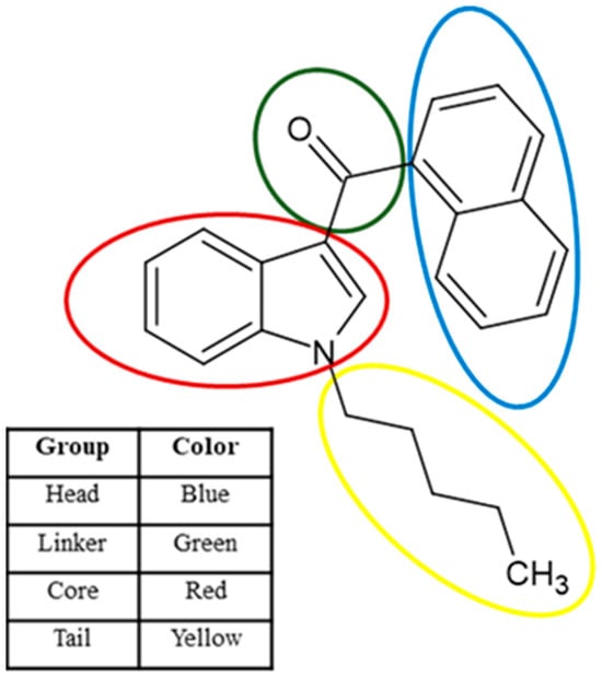 Synthetic cannabinoid nomenclature starts either with the initials of the chemist who synthesized them or common names that are abbreviations derived from the International Union of Pure and Applied Chemists (IUPAC) naming system. The IUPAC names of synthetic cannabinoids are impractical due to their length due to the complex structures of synthetic cannabinoids. The abbreviation should capture all key functional groups of the synthetic cannabinoid [13]. Structurally, these compounds consist of four unique groups: head, linker, core, and tail groups (see Figure 1) [12].