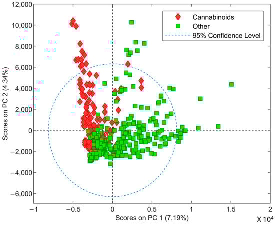 Mass spectral data were obtained from freely available GCMS databases: SWGDRUG Mass Spectral Library [6] and Cayman Chemical Spectral Library [14]. Mass spectra obtained from the SWGDRUG database (Versions 3.11) were used as the training set while mass spectra from Cayman Spectral Library (Cayman Chemical Company (CCC) Ann Arbor, MI, USA) were used as a test set. Mass spectral data were cropped to include the m/z range of 40 to 300 before being used for model development in this study. First, the data space of the training set was evaluated using PCA and HCA before the development of binary classification models. The primary goal of PCA was to see if any trends between the cannabinoids and other drugs were evident in mass spectral data. The PCA score plot (Figure 2) shows some separation between these two classes suggesting that supervised learning methods such as PLS-DA can be employed for discrimination. Although some samples seem to be outliers, these samples were not removed at this stage due to them having possibly important spectral information that can be useful in PLS-DA analysis. The HCA was used to investigate the possible grouping of cannabinoids. The dendrogram generated using the Wards method shows the clustering of classical cannabinoids. Additional clustering was observed for functional groups including the naphthyl head group, indole, and indazole/azaindole core groups (see Figure A2). These results show the feasibility of using supervised learning methods such as PLS-DA for building classification models.