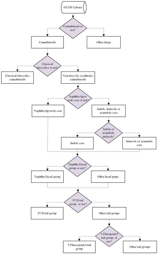 The aim of this study is to develop a classification system capable of identifying previously unknown cannabinoids and providing potential structural information about these compounds. The flow chart shown in Figure 3 illustrates the application of this system. In summary, the classification system begins by distinguishing cannabinoids from other drugs. Then, the classical cannabinoids that contain the tricyclic core structures are separated from synthetic cannabinoids that do not contain tricyclic core structures. Synthetic cannabinoids are further divided into those with a naphthoylpyrrole core and those with indole, indazole, or azaindole core groups. In the next step, compounds containing indole core groups are separated from compounds that have indazole or azaindole core groups. Then, naphthyl head groups containing compounds are separated from those with other head groups. Finally, two models were developed for FUB and 5-Fluoropentyl tail groups. For a suspected drug molecule with an unknown identity, the GCMS data should be projected onto the binary models to obtain structural information.