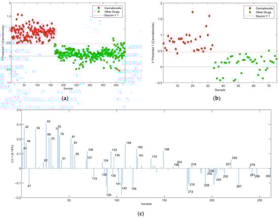 The first classification model was developed to discriminate cannabinoids from other drugs using PLS-DA. A genetic algorithm (GA) was employed for feature selection to identify the most relevant features (m/z values) for distinguishing between classes. Given that the mass spectral data in this study range from m/z 30 to 400, many features may not possess any discriminatory value, while some could introduce noise into the classification process [15]. The decision threshold is denoted by a red dashed line in the PLS-DA score plot, and samples with discrimination scores above the decision threshold are classified as cannabinoids, while those with scores below the threshold are classified as other drugs. LV1 of this model (Figure 4c) shows the use of a limited number of variables that can be associated with the use of GA for feature selection. Matthew’s correlation coefficient (MCC) was primarily used to determine the predictive ability of the developed models as this metric is reported as the most reliable evaluator for binary classifications. Additionally, the true positive rate (TPR), true negative rate (TNR), and F1 score were calculated for all the models in this study. For the model developed for cannabinoids versus other drugs, all the above matrices were found to be greater than 0.9700, demonstrating a very high predictive ability (see Table 1).
