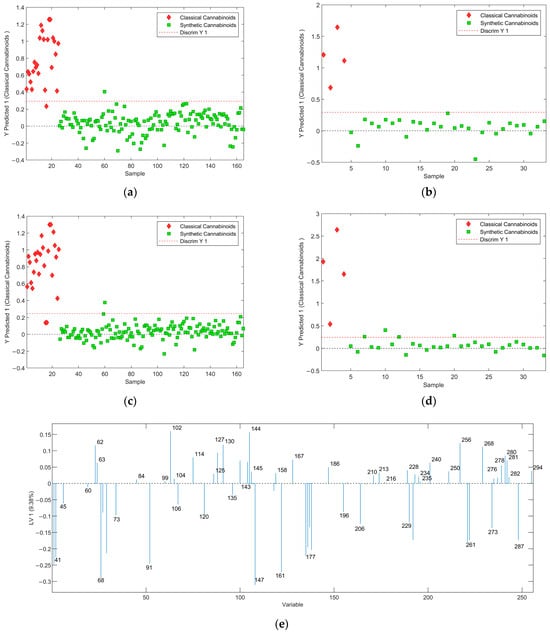 The Results of PLS-DA analysis of synthetic cannabinoids and classical cannabinoids: (a) score plot of the training set and (b) prediction set without using variable selection methods; (c) score plot of the training set and (d) prediction set with using GA as the variable selection method. (e) LV1 of the weights for the model developed using GA as the variable selection method.