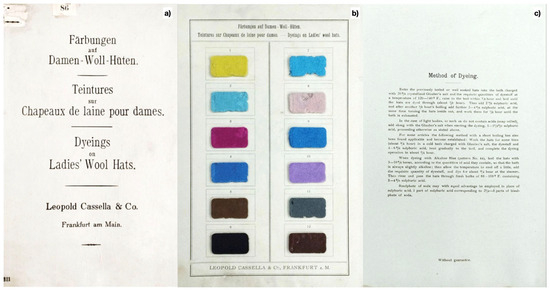 In this study, samples of wool dyed with early dyes from the pattern book “Färbungen auf Damen-Wool-Hüten/Teintures sur Chapeaux de laine pour dames/Dyeings on Ladies’ Wool Hats” published by the company Leopold Cassella & Co. (Frankfurt am Main, Germany) were analyzed. The investigated pattern book (Figure 1) is part of a massive and diversified compendium located at the Commodity Science Museum of the Department of Economics, Management, and Business Law at the University Aldo Moro of Bari (Italy) [1,2,3]. It is a sample book of synthetic dyes utilized for coloring woolen fabrics, particularly for the creation of women’s hats. It is divided into two sections. The first part provides a list of samples, the dye used, the percentage of dye used in each sample, and the etching process. The second part contains the samples presented as colored wool flaps.