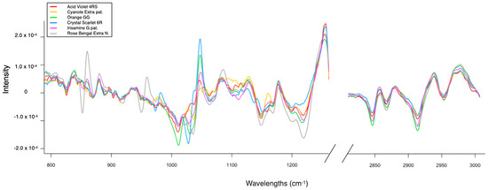 Figure 2 shows, for each sample, the average of the three acquisitions made as the most representative spectrum. We can notice the differences between them. Each color seems to have a distinct spectral shape; just look at the difference, for example, among the GG and the CS in the range between 1000 and 1100 cm−1, although they have a similar structure.