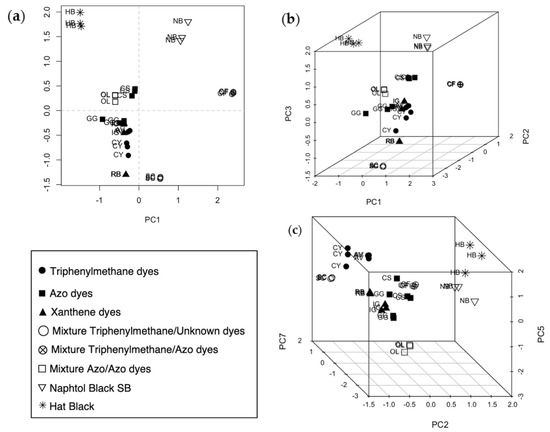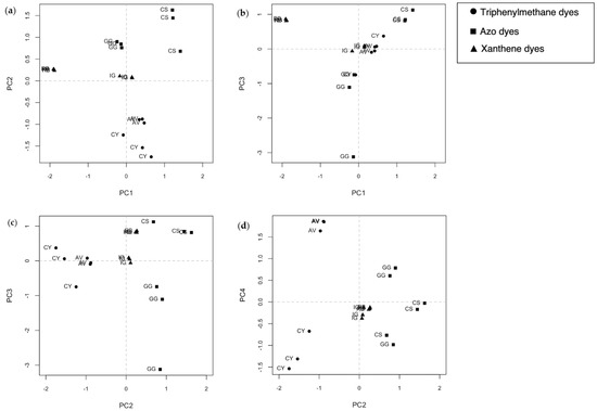 A PCA was performed as an exploratory analysis to visualize the similarities and differences between samples. The first four components describe 90.4% of the total variance (PC1 46.8%, PC2 23.7%, PC3 14.9, PC4 5.2%). From score plots in Figure 3, it can be seen that the dyed wool samples are grouped based on the type of dye and the distance between replicates, which could give us information about inhomogeneity. For example, only one replicate of GG tends to get away from the others in plots a–c. The plots also suggest that the samples can be separated by functional group according to PC2: the triphenylmethane dyes are approximately located at PC2-negative and the azo and xanthene dyes at PC2-positive.