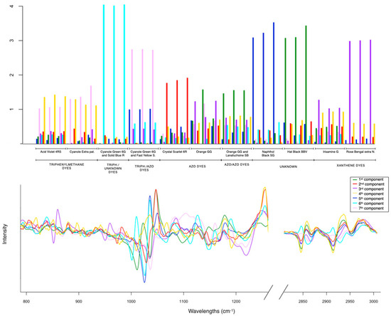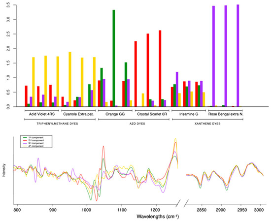 The first and second components (in red and green, respectively) are related to the azo dyes. Both components present the pure spectra with several peaks in the range between 1030 and 1200 cm−1, attributed to the S-O vibration characteristic of azo dyes. The component shown in red is very dominant in the fabric dyed CS, whereas the second component is more present in the GG sample. The clear distinction between the first two components is consistent with the results of the PCA, showing the different characteristics of CS and GG (samples were far away from each other). Furthermore, the replicates of the different samples generally have a similar distribution of components (see bar distribution). In cases where the differences in intensity are greater, this could be an indication of sample inhomogeneity, as is the case with GG, which is in agreement with the PCA results. The third component (in violet) is very dominant in the xanthene dyes. The sample RB is totally described by this component. Otherwise, in the case of IG, the contributions of other components are required to define the structure.
