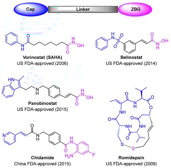 HDAC inhibitors (HDACis) have proved to be effective anticancer agents, owing to the potential capacity to inhibit cancer cell invasion, sensitize the cancer cells to chemotherapy, induce apoptosis, and boost immunogenicity [13]. To date, four HDACis, vorinostat (SAHA), belinostat, panobinostat, and romidepsin, have gained US Food and Drug Administration (FDA) approval for the treatment of refractory or relapsed cutaneous and peripheral T-cell lymphomas or multiple myeloma. Chidamide is another HDACi approved by the China FDA for the treatment of peripheral T-cell lymphoma (Figure 1) [14,15,16]. However, most HDACis are associated with adverse side effects, such as fatigue, nausea, thrombocytopenia, and neutropenia, prompting the search for new HDACis [4,17,18].