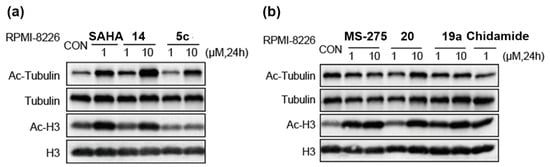 RPMI-8226 cells were seeded in six-well plates and treated with compounds for 24 h. Cells were lysed with 1× SDS loading buffer (50 mM Tris pH 6.8, 100 mM DTT, 2% SDS, 0.1% bromophenol blue, 10% glycerol), and then centrifuged at 12,000 rpm for 5 min at 4 °C. Cell extracts were probed with antibodies Ac-Tubulin (#5335T, CST, Kansas City, MO, USA), α-Tubulin (#2144S, CST, Kansas City, MO, USA), AcH3 (#ab39139, active motif, Carlsbad, CA, USA), Histone H3 (#17168-1-AP, Proteintech, Chicago, IL, USA), GAPDH (#60004-1-1g, Proteintech, Chicago, IL, USA), Goat Anti-Mouse IgG, H&L Chain Specific Peroxidase Conjugate (#401215, Calbiochem, Darmstadt, Germany), Goat Anti-Rabbit IgG, or H&L Chain Specific Peroxidase Conjugate (#401353, Calbiochem, Germany), then detected using Bio-RAD power pal Basic (#041BR66615, BioRad Laboratories, Hercules, CA, USA), Bio-RAD Mini-PROTEAN Tetrade System (#IEC/EN 61010-1, BioRad Laboratories, Hercules, CA, USA), or Bio-RAD Chemi Touch Imagin (BioRad Laboratories, Hercules, CA, USA).