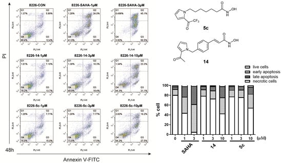 RPMI 8226 cells were treated with compounds 14 (1, 3, 10 μM), 5c (1, 3, 10 μM), and SAHA (1, 3 μM) and DMSO (0.1%) for 48 h, and then stained with Annexin-V-FITC and propidium iodide (PI) and analyzed by flow cytometry.