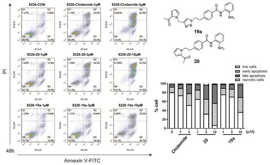 RPMI 8226 cells were treated with compounds 20 (1, 3, 10 μM), 19a (1, 3, 10 μM), and chidamide (1, 3 μM) and DMSO (0.1%) for 48 h, and then stained with Annexin-V-FITC and propidium iodide (PI) and analyzed by flow cytometry.