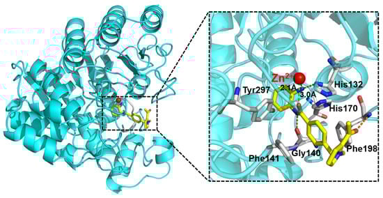 Binding pose of 20 with HDAC1 predicted by molecular docking (PDB entry: 1C3S). The figure was generated using PyMol (http://www.pymol.org/, accessed on 7 May 2024). Dash green lines represent the chelation of ZBG and zinc ions; Dash orange lines represent hydrogen bonding.
