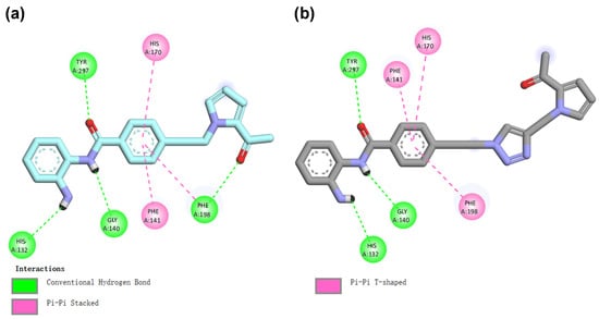 The docking results revealed that compound 20 could effectively penetrate the active pocket of the protein (Figure 6). The N-(2-aminophenyl)benzamide group of compound 20 chelated the Zn2+ ion well in a bidentate fashion, maintaining a distance of 3.0 Å to the oxygen atom in the carbonyl group and 2.1 Å to the nitrogen atom in aniline, respectively. In addition, the N-(2-aminophenyl)benzamide group also formed hydrogen bonding interactions with His132, Gly140, and Tyr297, respectively. The carbonyl oxygen of the 2-acetylpyrrole cap group formed a hydrogen bond with Phe198. The phenyl group within the linker fit well into the hydrophobic channel, engaging in π–π interactions with Phe198 and Phe141 in a face-to-face configuration, and with His170 in an edge-to-face orientation (Figure 6 and Figure 7a). For comparison, in the binding model of compound 19a with HDAC1, the introduction of triazole resulted in a displacement and flip of the 2-acetylpyrrole group towards the outer solvent region, thereby abolishing the hydrogen bonding interaction with Phe198 and subsequently reducing the affinity (Figure 7b). In summary, molecular docking revealed that compound 20 interacts more closely with HDAC1, thus further validating the experimental findings.