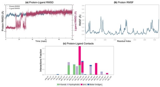 Molecular dynamics simulation of the docked complex of 20-HDAC1. (a) RMSD of HDAC1 protein backbone atoms (blue line) and 20 (red line) monitored throughout the 100 ns; (b) RMSF of HDAC1 residue; (c) histogram showing interaction fractions.