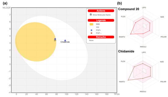 The Boiled-Egg model of 20 shows high gastrointestinal (GI) absorption, indicating potentially good overall oral bioavailability (Figure 9a). Furthermore, 20 is predicted as passively traverse the brain penetration (BBB, at the yolk edge), but it can be pumped out of the brain by P-glycoprotein (P-gp, blue dot), thereby reducing its absorption and penetration into the brain [42,45]. As depicted in Figure 9b, the bioavailability radar of compound 20 also highly resembles that of chidamide.
