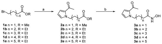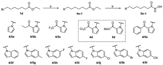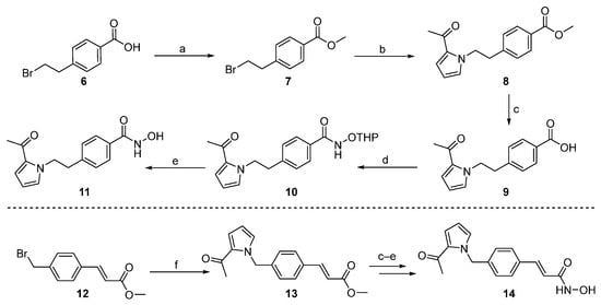 Firstly, we synthesized hydroxamic acid-based SAHA-like targeting products 3a–e comprising aliphatic linkers of various lengths (Scheme 1). The reactions of commercially available bromo esters 1a–e with 2-acetylpyrrole under basic conditions successfully provided intermediates 2a–e. Next, compounds 2a–e were converted into the target compounds 3a–e in a single step by using hydroxyamine in the presence of potassium hydroxide. Through a similar two-step procedure, the target compounds 5a–l were successfully synthesized from ethyl 7-bromoheptanoate (1d) (Scheme 2). Particularly, the 2-trichloroacetyl pyrrole derivative 4d yielded the methyl ester 5d. Two more target compounds 11 and 14 were synthesized by similar procedures from brominated starting materials 4-(2-bromoethyl)benzoic acid (6) and methyl (E)-3-(4-(bromomethyl)phenyl)acrylate (12), respectively (Scheme 3).