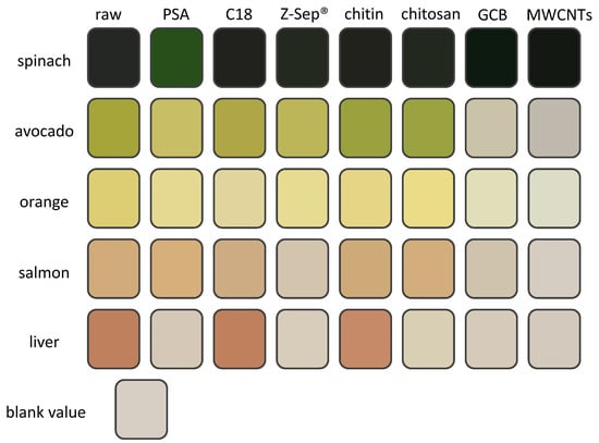 In the first step, the raw and cleaned-up extracts were visually examined. Figure 2 shows the colors of each extract after clean-up with different dSPE sorbents. The colors were taken from the pictures shown in Supplementary Material Figure S2, for better comparison. The spinach extracts showed no difference in color or intensity except after clean-up with PSA, where they had a lighter, less intense green color. For the orange, avocado, salmon, and liver, the sample clean-up with both GCB and MWCNTs led to a nearly colorless extract, significantly reducing the coloring matrix components, as they are commonly applied to remove large nonpolar molecules like pigments. In the avocado extracts, the application of PSA and Z-Sep® also slightly reduced the intensity of the color of the extract. This effect was also observed for liver extracts, where PSA and Z-Sep®, and additionally chitosan, removed most coloring matrix components. For the salmon extracts, a reduced intensity was also present after the clean-up with Z-Sep®. The colors were extracted from the pictures shown in Supplementary Material Figure S2, where the blank value represents the color of the background. The color transition between Figure 2 and Supplementary Material Figure S2 was achieved by extracting the color of the respective matrix extract from Supplementary Material Figure S2 via the Microsoft Office PowerPoint 365’ eyedropper tool. The colors in Figure 2 have the same RGB code as the according matrix extracts in Supplementary Material Figure S2.