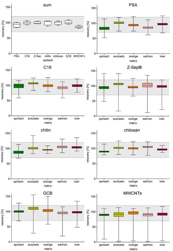 Analysis of the recovery data. For each matrix cleaned-up with each sorbent, the mean recovery across all analytes was calculated, resulting in one value per matrix and sorbent. The box plots represent the recoveries for the five different matrices, the lines represent the median recoveries, and the whiskers show the minimum and maximum values. The table containing all individual recovery values can be found in Supplementary Material Table S2.