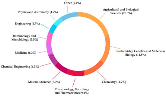 Figure 1 summarises, by subject area, the descriptive analysis of the gathered data from 2014 to 2024 using “hydrosols”, “antimicrobials”, and “activity” in the Scopus database. This highlights the importance of valorising and applying this byproduct across various fields.