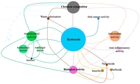 Analysing the published documents allows for the identification of the most frequently addressed topics in hydrosol research. This is illustrated in Figure 2, where the size of each circle is proportional to the number of published works. The descriptive analysis, which compiled data from the Scopus database spanning 2014 to 2024, reveals that the most extensively researched topics are “biological activity” and “chemical composition.” These areas are closely linked to hydrosol characterisation, with antioxidant and antimicrobial properties being the most studied bioactivities. Moreover, recent trends in the literature emphasise emerging topics, including anti-cancer and anti-inflammatory bioactivities, hydrosols as biopesticides (insecticidal, nematocidal, and herbicidal applications), and waste valorisation.
