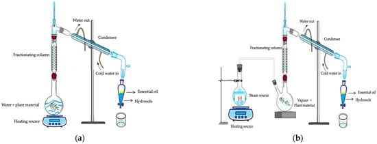 Schematic representation of (a) hydro distillation and (b) steam distillation setups.