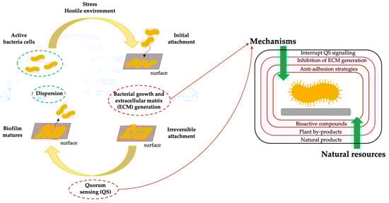 The anti-biofilm potential of natural compounds encompasses the inhibition of the polymer matrix formation, suppression of cell adhesion and interruption of the extracellular matrix (ECM) attachment, decreasing the virulence production factors, and thereby blocking the formation of a quorum sensing (QS) network and biofilm development [124]. The initial stages are extremely important, particularly the adhesion stage, which involves cytoskeletal elements such as flagella, fimbriae and the production of lipopolysaccharides. This is followed by forming a QS network within the bacterial group, essential in biofilm formation. Therefore, targeting one or both stages is vital for inhibiting biofilm development [125]. Bioactive compounds can act through different mechanisms, as follows: (i) anti-adhesion strategies, as the adhesion stage is primarily influenced by surface properties such as electrostatic charge and hydrophobicity, bacterial surface attachments, and environmental factors like temperature, exposure time, and nutrient composition; (ii) inhibition of ECM production by disrupting the generation of compounds such as DNA, proteins, carbohydrates, thereby preventing biofilm maturation, coaggregation, and efflux pump activity; (iii) disruption of QS signalling by blocking cell-to-cell communication, either through the inhibition and degradation of signalling molecules or by mimicking these signals to prevent their binding to receptors [124,125,126,127].