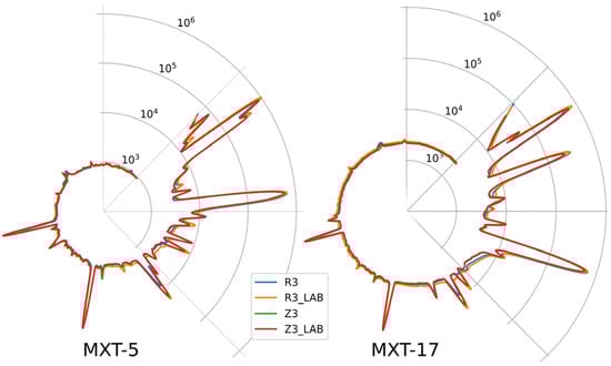 Radar plots of the chromatograms of selected wines obtained with ultra-fast GC; the circumference of the plots denotes retention time (100 s in total), and the radius denotes abundance (signal of FID detectors) in a logarithmic scale; MXT-5, MXT-1701—chromatographic columns. For all wine samples, AF was conducted by a Saccharomyces cerevisiae yeast strain (Essentiale Grand Cru); R3—a Rondo wine, spontaneous MLF (without LAB addition); R3 LAB—a Rondo wine, MLF induced by inoculation with LAB after AF; Z3—a Zweigelt wine, spontaneous MLF; Z3 LAB—a Zweigelt wine, MLF was carried out by LAB added after AF.