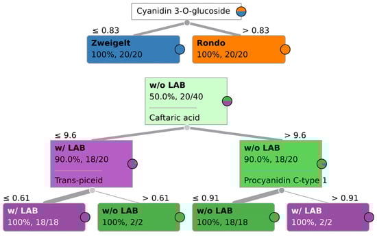 An example of classification tree, specific for this particular dataset, for determining grape variety and addition of LAB in the winemaking process based on the results of sample analysis using UPLC-PDA-MS/MS; Rondo–Rondo wines in which AF was carried out by various yeast strains and MLF was spontaneous or induced by inoculation with LAB; Zweigelt–Zweigelt wines in which AF was carried out by different yeast strains and MLF was spontaneous or induced by inoculation with LAB; w/o LAB–Rondo and Zweigelt wines in which AF was conducted by various yeast strains and MLF was carried out without the addition of LAB; w/LAB–Rondo and Zweigelt wines in which AF was conducted by various yeast strains and MLF was induced by inoculation with LAB.