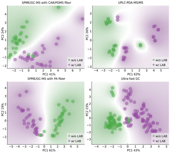 The results of chromatographic analyses of wine samples using different methods served as inputs for ML analysis and were treated as fingerprints for classification based on grape variety and whether or not LAB were added in the winemaking process. The entire dataset consisted of 60 objects (individual analyses) and 46 features (i.e., separated compounds) for SPME/GC-MS with CAR/PDMS fiber, 40 objects and 55 features for UPLC-PDA-MS/MS, 60 objects and 67 features for SPME/GC-MS with PA fiber, and 147 objects and 133 features for ultra-fast GC (Supplementary Scheme S1). First, features with more than 50% missing values (e.g., due to the underlying concentrations of the separated compounds in the samples being below the LOQ) were purged from the dataset. Then, the features from each of the methods were normalized to the [0, 1] interval. Two target categorical features, namely grape variety and addition of LAB, were assigned to each object. PCA was performed in order to visualize the object distribution based on the two categories and to identify potential outliers.