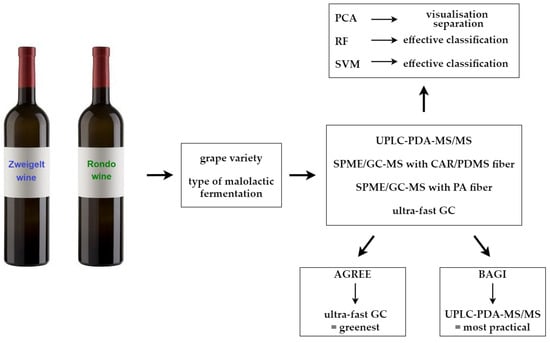 In Poland, there have been cases of mislabelling with a false declaration of grape variety, e.g., designating a Rondo wine as a Zweigelt wine to obtain a higher profit. Rondo is one of the most frequently cultivated red grape varieties, while Zweigelt is much less common [13,14]. The aim of the present study was two-fold: firstly to determine volatile compound fingerprints of Zweigelt and Rondo wines using ultra-fast GC and secondly to compare the effectiveness of this method with regard to the varietal classification of wines and assess the type of MLF, as well as the greenness and blueness of this approach with three other chromatographic methods described in our previous publications: UPLC-PDA-MS/MS, headspace solid-phase microextraction/gas chromatography-mass spectrometry with carboxen-polydimethylosiloxane fiber (SPME/GC-MS with CAR/PDMS fiber), and headspace solid-phase microextraction/gas chromatography-mass spectrometry with polyacrylate fiber (SPME/GC-MS with PA fiber) [13,14,25].