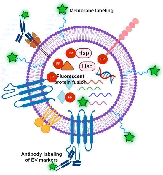 Illustration of various labeling strategies of EVs, such as lipophilic dyes for non-specific EV labeling, a fluorescent antibody targeting EV surface markers, or fluorescent protein (FP) fused to either surface proteins or internal cytosolic proteins, and mRNA labeling.
