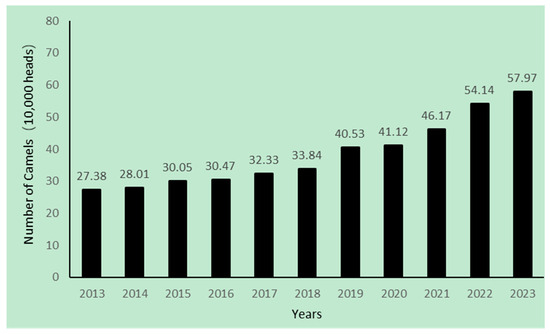 Throughout Chinese history, camels have played a crucial role in civilization. Due to their unique adaptations to diverse and extreme environments, camels became the primary means of caravan traffic along the Silk Road, facilitating long-distance migration in desert areas. Beyond their role as pack animals, camels provide economically deprived communities with milk, meat, and wool. Most camels in China are Bactrian, mainly distributed in mountainous and marginal regions, where dairy camel farming is increasingly viewed as a profitable business. According to the National Bureau of Statistics, China’s camel population has grown at a compound annual growth rate of 10% from 2013 to 2023, reaching approximately 579,700 camels in 2023 (Figure 1). The majority are found in the provinces of Xinjiang (52.44%), Inner Mongolia (37.62%), Gansu (7.19%), and Qinghai (2.48%) [12]. The “National List of Animal Genetic Resources and Varieties” (2021) characterizes China’s camel genetic resources by five defined breeds: Alxa BC and Sonid BC from Inner Mongolia, Tarim BC and Junggar BC from Xinjiang, and Qinghai BC [13].