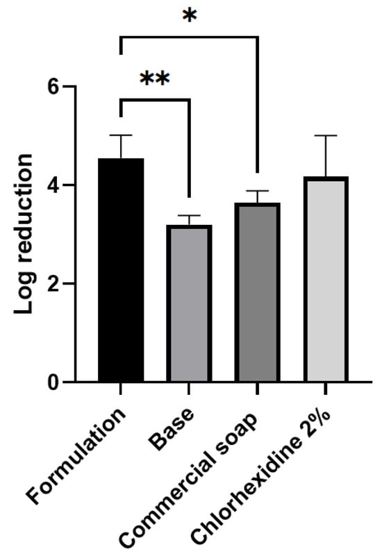 The soap containing essential oils exhibited the highest logarithmic reduction factor value (4.55), whereas the other analyzed products showed lower values (3.20 for commercial soap and 3.65 for chlorhexidine) (Figure 1).