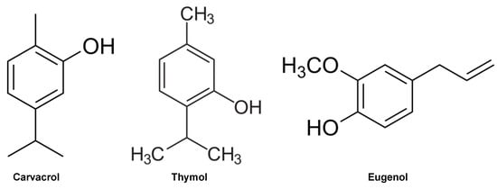 Essential oils are complex mixtures of natural compounds, typically containing 20 to 60 constituents in varying proportions. Among these constituents, carvacrol, thymol, and eugenol (Figure 2) stand out, comprising a significant proportion of oregano, thyme, and clove oils, respectively [5,18,19,20]