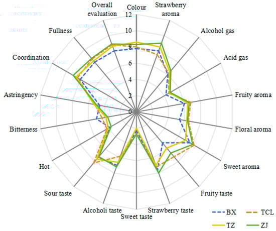 In sensory evaluations, both volatile and non-volatile components are assessed simultaneously, and strawberry wine is mainly characterized by its appearance, aroma, taste, and overall body [11,15]. In this study, the sensory characteristics of four strawberry wines were quantitatively and descriptively analyzed, and 18 descriptors and their corresponding reference samples were identified (Figure 1). The sensory profiles of the four wines differed significantly based on fruit and flower notes. In terms of aroma attributes, TCL had the highest scores for fruity and floral notes, whereas ZJ had the highest scores for coordination (9.0) and overall evaluation (8.9). In contrast, BX had the lowest coordination and overall evaluation scores.