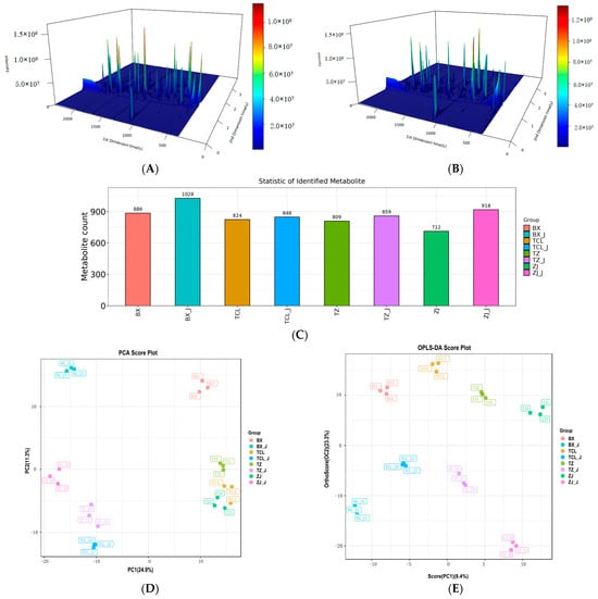 The error detection rate was used to correct the p-values to reduce false-positive results, and the variables were preliminarily screened on the basis of a p-value of less than 0.05 and a Pearson correlation coefficient |r| greater than 0.6. Data selected by one-way ANOVA were used for multivariate statistical analyses after scaling by unit variance. PCA and OPLS-DA were performed using SIMCA-P 14.1 software. Cluster heat and radar maps were plotted using the BioDeep online analysis platform (https://www.biodeep.cn/, accessed on 16 August 2024.). The correlative network of data pairs satisfying |ρ| > 0.6 and p < 0.05 was visualized with Gephi (Version 0.9.1).