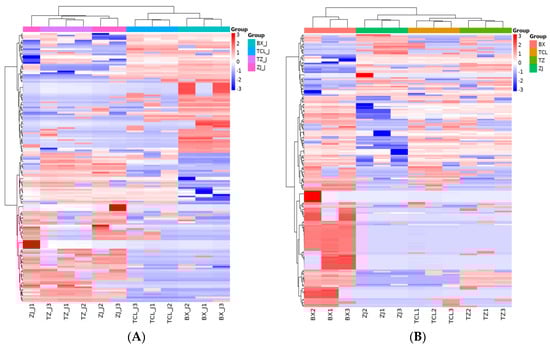Figure 3 shows the relative amounts of VOCs in strawberry juice and wine, with differences indicated by different colors, where a darker red color indicates a higher relative amount and a darker blue color indicates a lower relative amount. The inner columns represent the samples, the rows represent the metabolites, and the cluster tree on the left represents the clustering of the differential VOC species. In BX_J, the levels of 1-hexanol, 1-butanol-3-methyl-acetate, 5-methylhexanoic acid, 2-pentanone, and 2,3-butanedione were relatively high. In contrast, butanedioic acid diethyl ester, 2-pentanone, ethyl-5-methylhexanoate, 2-ethyl-1-propanol, 2-methyl-butanoic acid, and linalool levels were relatively high in BX wine. In the ZJ wine, the levels of linalool, 2-ethyl-1-propanol, ethyl-2-hydroxy-3-phenylpropanoate, butanedioic acid diethyl ester, and 2,3-butanedione were relatively high, imparting cheesy, floral, and flowery aromas to the wine [11,23].