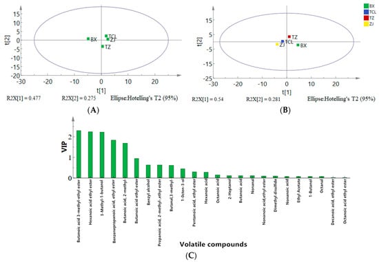 Coordinate and variable importance in projection (VIP) analyses based on the relative odor activity values of key differential VOCs in strawberry wines of different cultivars. (A) PCA. (B) OPLS-DA. (C) VIP value.