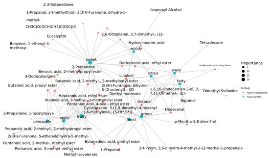 With the FlavorDB2 database [34], the iGraph tool was used to build a network diagram of the relationships between flavor substances to impart unique sensory flavor characteristics. In Figure 5, the green circles represent sensory features, and the red circles represent flavor compounds. A larger green circle indicates that more types of flavor compounds are associated with that sensory feature, rendering that feature more important. By contrast, a larger red circle indicates that more sensory features are associated with the flavor compound, rendering it an important flavor substance. By default, the top 10 sensory features were used to create a network diagram.