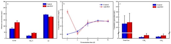Figure 2c depicts a comparison of methane, CO2, and total gas production accumulation after 36 days of co-digestion operation. The control group without PET pellets produced 247.61 ± 29.57 mL of methane and 53.45 ± 8.87 mL of CO2 during digestion. PET particles increased methane and CO2 production by 61.45 ± 11.07 mL and 18.70 ± 3.18 mL, respectively, with an inhibition rate of 75.18% and 65.01%. This suggests that PET had a significant inhibitory effect on methane and CO2 production from anaerobic digestion in the mixed system, stronger than that found by other researchers in their papers. Furthermore, PET greatly reduces the overall quantity of gas generated. According to Wang et al.’s study on the effect of PET on anaerobic digestion of food waste, PET with an abundance of 2.70 mg/g TS (about 0.170 particles/g TS) had the highest inhibitory performance of 21.6% on cumulative methane production [29]. This inhibitory effect was shown to be connected with PET particle size, with larger particles having a less significant inhibitory effect, a difference that might be attributed to the digestion sludge’s properties as well as the particle size of the microplastics. Since both steps are interconnected, it is commonly acknowledged that the methanogenic step is more vulnerable to unfavorable environmental factors and that inhibiting the acidogenic step can eventually worsen methanogenesis [50].