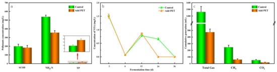 NH3-N is produced during the biodegradation of proteins or other nitrogenous compounds. During co-digestion, the NH3-N concentration increased by 538.67 ± 67 mg/L in the control group, while it decreased by 32.0% to 356.50 ± 23.73 mg/L in the experimental group with PET addition. This variation is consistent with the changes in SCOD. Appropriate ammonia levels are essential for maintaining system stability during anaerobic digestion and providing buffering capacity for active microbial processes [45]. However, excessive NH3-N levels can lead to systemic toxicity and hinder anaerobic digestion [46].