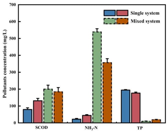 The concentration growth of contaminants in the two digestion scenarios is compared, and the findings are shown in Figure 3. SCOD, an indicator of dissolved organic matter in sludge, increased more in the co-digestion system than in the mono-digestion, at rates of 153.2% and 40.5%, respectively. This finding suggests that mixed fermentation of septic tank sludge with AGS can significantly increase cell lysis and organic matter release. However, the inclusion of PET alters the relative rate of change. The concentration changes of ammonia nitrogen followed the same trend as that of SCOD, with both showing larger concentration increases in the co-digestion system than in the mono-system. The co-digestion system increased ammonia nitrogen concentrations by 538.67 ± 18.9 mg/L and 356.5 ± 23.7 mg/L, much greater than the mono-system’s 22 ± 4.36 mg/L and 44.33 ± 4.51 mg/L, respectively. This data completely demonstrates the effect of the digestion system on the concentration of ammonia nitrogen. Although compound digestion can boost digestion efficiency, it also raises the environmental risks of septic tank sludge. TP concentration variations were consistently in the opposite direction of SCOD and ammonia levels. In the co-digestion of AGS and septic tank sludge, the increase in the concentration of total phosphorus was as low as 9.67 ± 1.7 mg/L and 18.43 ± 2.3 mg/L, respectively. The increase in the mono-system was 20 and 10 times higher than that in the co-digestion system. This finding proves that co-digestion can significantly minimize phosphorus release and subsequent treatment pressure, but it has a detrimental effect on phosphorus recovery. Overall, the digestion scenario significantly influenced the changes in pollutant concentrations during the anaerobic digestion of septic tank sludge. When compared to mono-digestion, co-digestion resulted in much larger increases in SCOD and NH3-N concentrations. The concentration of NH3-N in the co-digestion system was 8.1–24.5 times higher than in the mono-system, which could pose serious impacts on aquatic ecosystems if discharged into the environment without treatment [58,59].