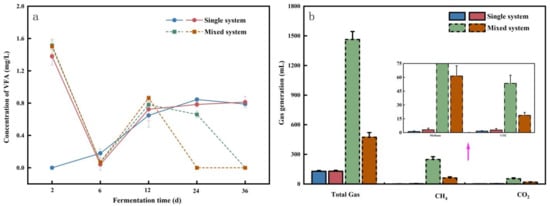 Comparison of acid and cumulative gas/methane production in different digestion systems: (a) Comparison of VFA concentrations between the two digestive systems; (b) Comparison of gas generation between the two digestive systems.
