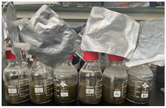 Mono-digestion system: 500 mL serum bottles filled with 100 mL septic tank sludge and 200 mL ultrapure water; 36 PET microplastic particles (at a concentration of 3 particles/g-TS) were added to the experimental group, and the blank group had no PET. Co-digestion: 500 mL serum vials filled with 100 mL septic tank sludge, 232 mL AGS, and 100 mL ultrapure water with a vs. ratio of 2.0 ± 0.1, the experimental and blank group is the same as mono-digestion. The actual anaerobic digestion reaction bottles are shown in Figure 5, and three parallel experiments were set up for each group, for a total of four groups and 12 digestion reaction bottles, which were performed simultaneously. The digestion was done in a water bath (37 ± 1 °C) and bottles were shaken manually every day to ensure even sludge distribution. All tests lasted approximately 36 days until the gas produced was minimal. The gas in the gas bags was removed during the experiment per the amount of sludge gas produced to analyze its components. Simultaneous sludge samples were collected to track any variations in the concentrations of TP, NH3-N, SCOD, and VFA.
