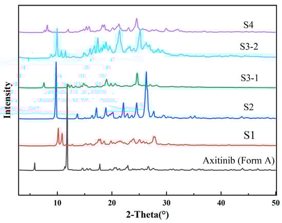 The PXRD patterns of the solvates of AXTN are shown in Figure 2. Among them, S1–S4 represent solvate of AXTN-acetonitrile, solvate of AXTN-DMF, solvate of AXTN-acetic acid, and solvate of AXTN-methanol, respectively. Figure 2 shows that the PXRD patterns of different solvates are significantly different. For S2 and S3–1, these solvates have been reported in the literature [30] (CSD code: QARVAK and QARVIS), and each has the same PXRD pattern and TGA pattern. The comparison of the PXRD patterns of the solvates obtained in this work and the existing solvates is shown in Figure S1 of the Supplementary Materials.